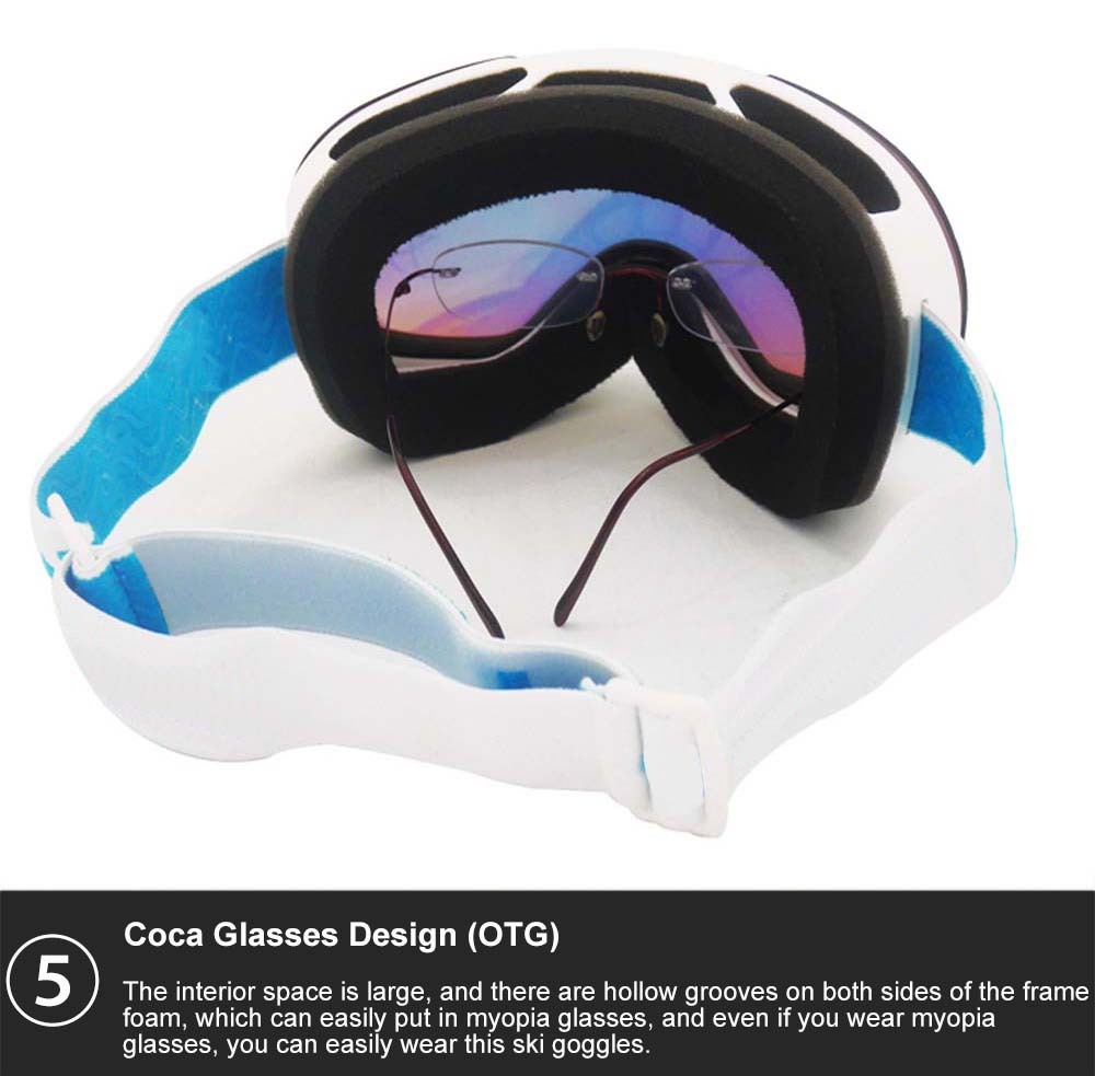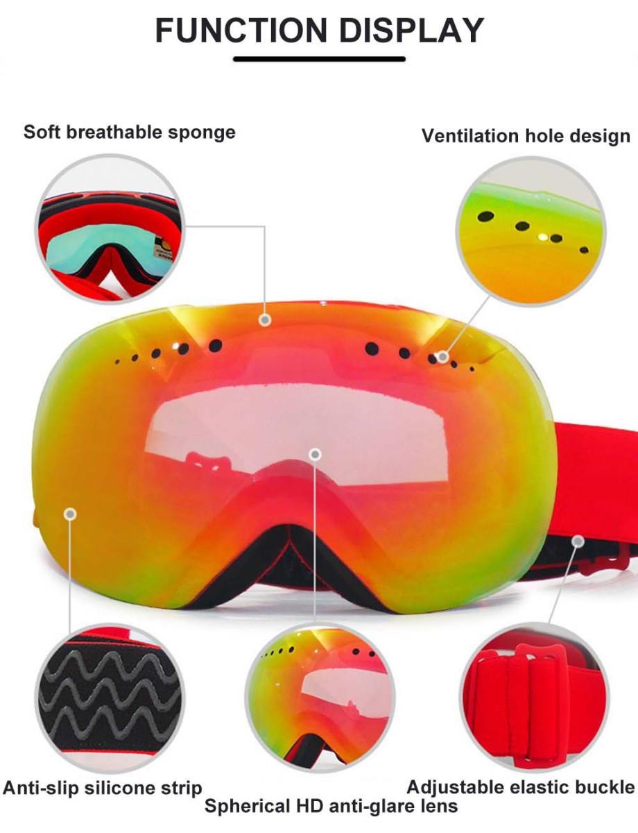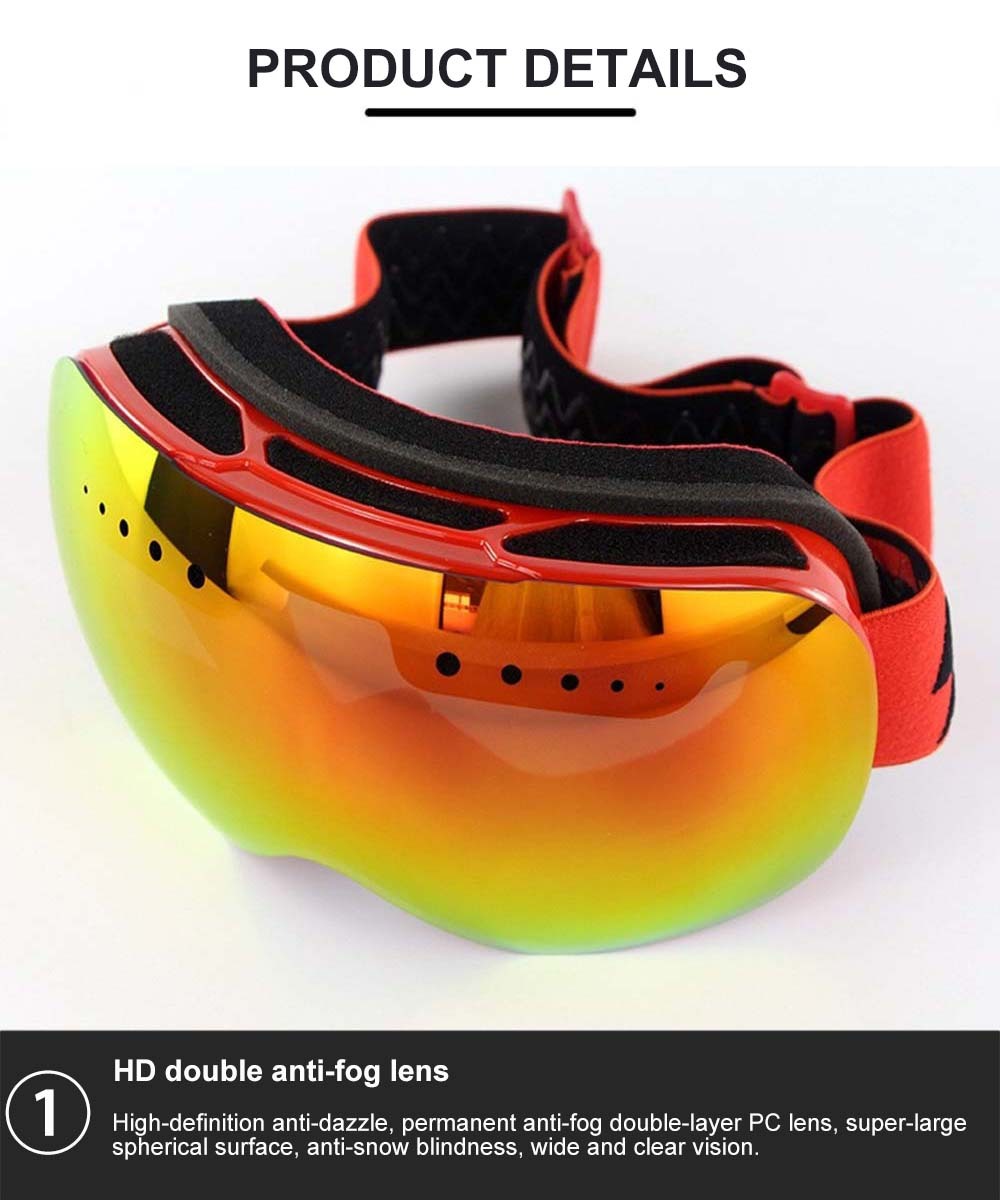Best ski goggles for glasses High-definition anti-dazzle, permanent anti-fog double-layer PC lens, super-large spherical surface, anti-snow blindness, wide and clear vision.According to the face shape of European and American people, the design is humanized and clings to the face.Best ski goggles for glasses three layers of soft and breathable foam are adopted, so that the hot air discharged from the skin of the face during skiing is emitted to the outside of ski goggles.The permanent anti-fog double-layer lens design forms an air insulation layer between the two layers of lenses to ensure the internal warmth of the lenses, thus achieving the anti-fog effect.There is a protective film inside the lens, which can be torn off when in use.