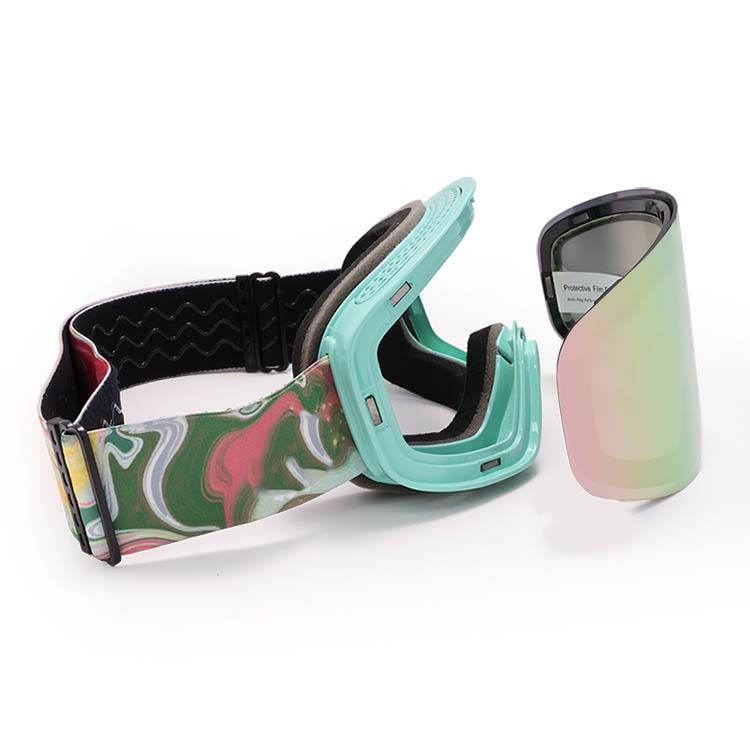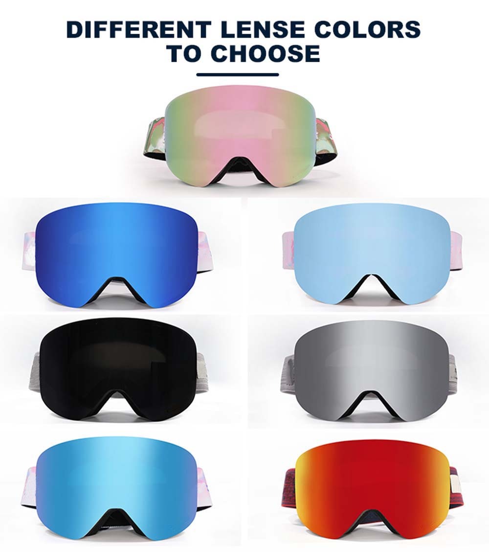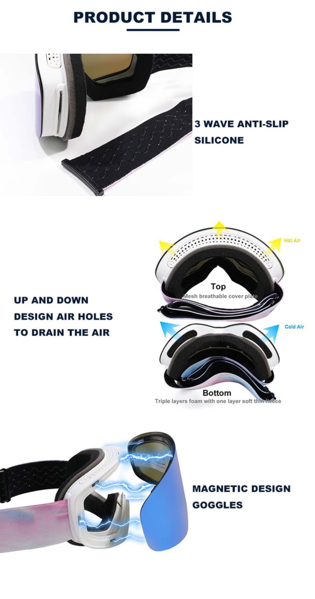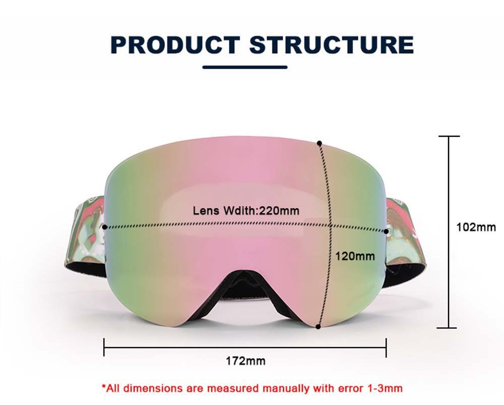Customize snow goggles large cylindrical, lens provides a truly unobstructed & wide view of the slopes. Ski Goggles with three layers of breathable foam and high-quality TPU frames can make you feel comfortable and let you enjoy skiing with all your heart.Interchangeable Lens & Magnet Design,The extra large cylindrical lens is secured by 8 magnets under a stabilization bezel to offer peripheral view and distortion-free clarity. It stays firmly while you are on the slope, but will pop out easily when lens-switch is needed.High performance UV Protection & Anti-fog,Customize snow goggles with unique anti-fogging treatment and 100% UV400 protection coating. This snow goggles gives you a fog free environment while you are enjoying skiing.OTG & Anti slip strap,Over the glass designed ski goggles to fit small to medium size glasses. Anti slip and extra long elastic strap for better helmet compatibility and keep the snow goggles in place. Specially designed for skiers, more convenient and safer to use.Professional Ventilation,Designed to reduce fogging and optimizes the flowing air over the inside of the lens. Customize snow goggles provide smooth air-flow system which brings fresh air and exhaust moisture quickly and effectively.